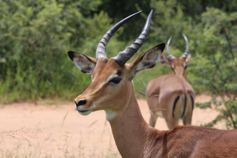 Импалы или чёрно пятые антилопы предпочитают саванны Южной Африки. На задних ногах у них проходят тёмные полосы, а над копытом растут пучки чёрной шерсти. Сами они рыжие с большими глазами.