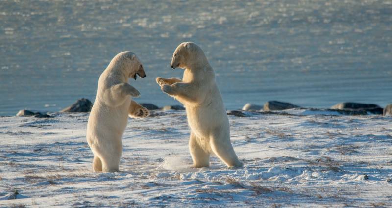 Обычно северные медведи одиночки по характеру. Но при вынужденных обстоятельствах, чаще на берегу, создают группы, где устанавливается главенство самого крупного самца.