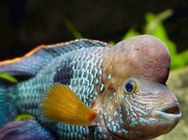 Голова пологой формы, глаза крупные и выразительные, рыбка смотрит словно сосредоточенно и серьёзно. У самцов также на голове имеется нарост, увеличивающийся с возрастом. У самок он отсутствует.