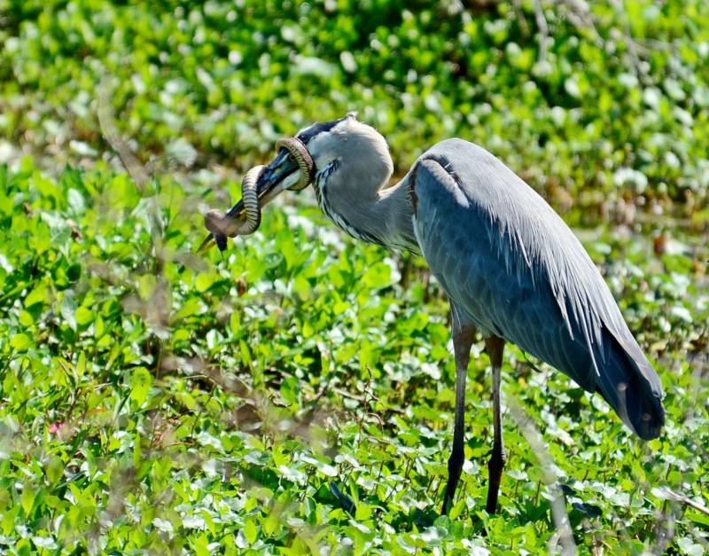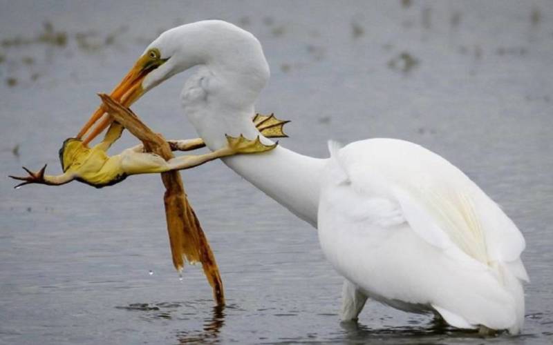 - Интересно наблюдать за охотящейся цаплей: выбрав удобный момент, она стремительно нападает и хватает жертву цепким клювом. Добыча сопротивляется, тогда птица бросает её вниз на долю секунды и хватает вновь. Так несколько раз, пока жертва не ослабнет. Хищница может глотать добычу сразу.