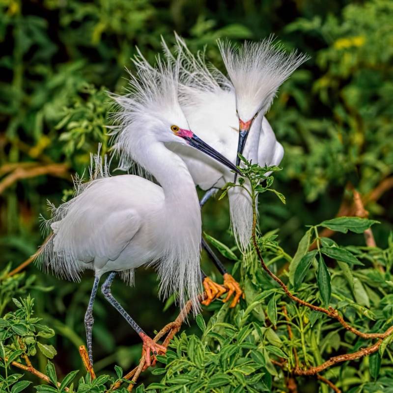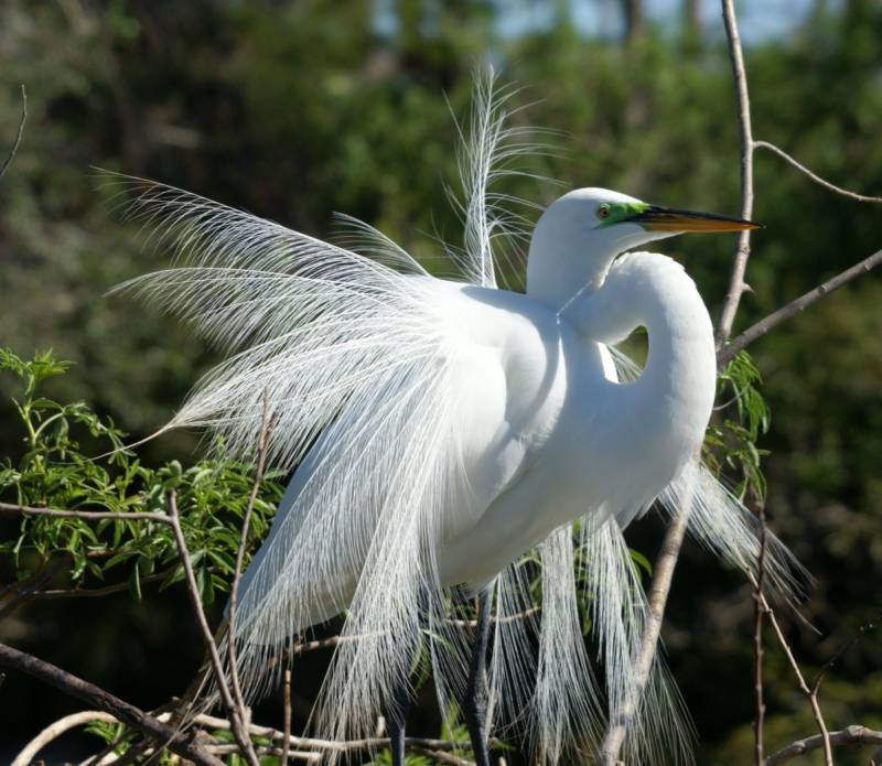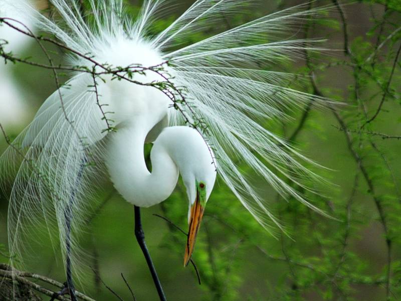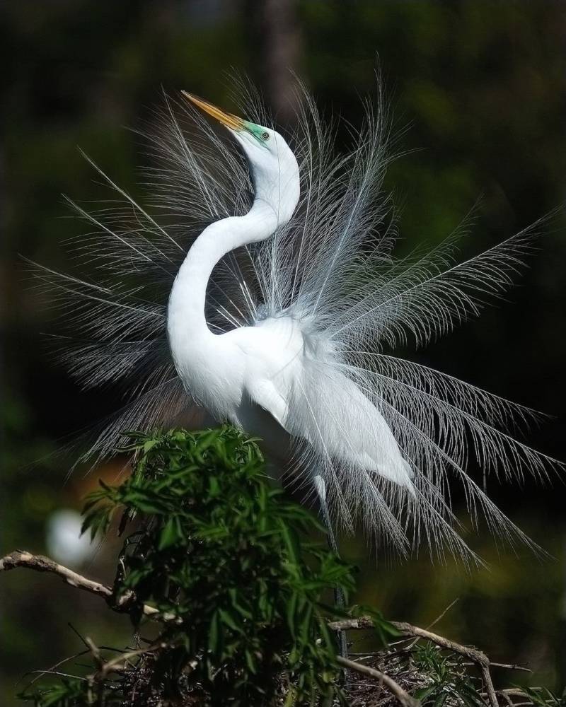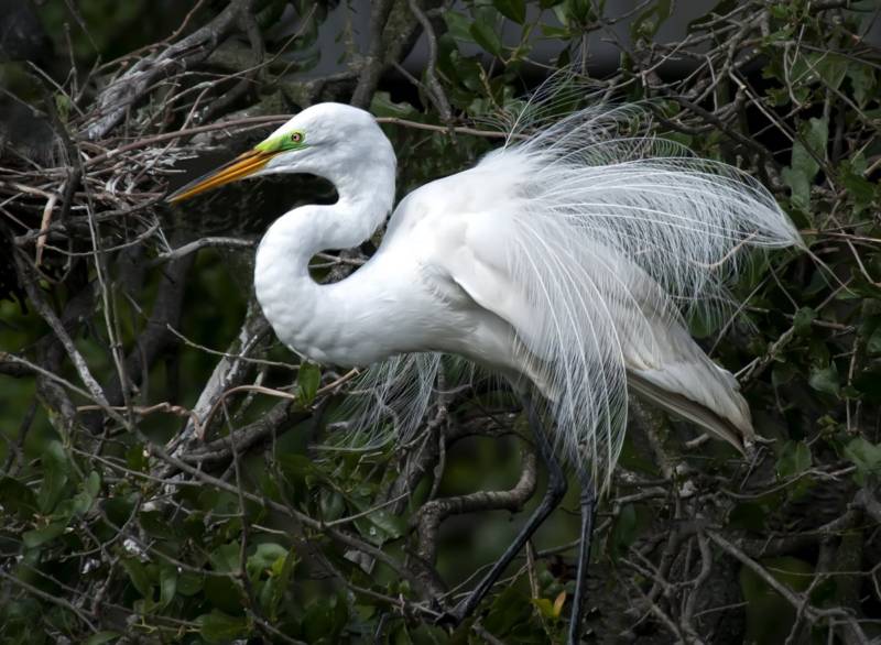 В брачный период самец серой цапли выбирает самку. У него отрастают красивые длинные перья на спине, распускается хохолок, меняется цвет у клюва и глаз.