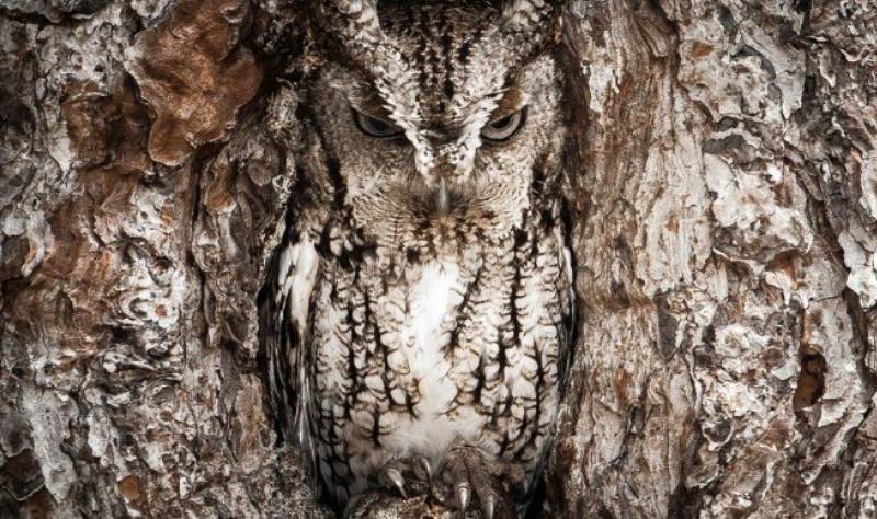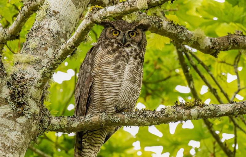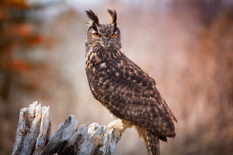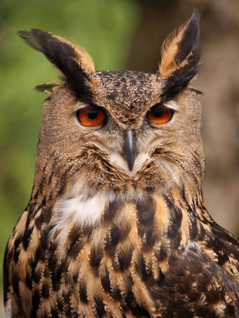 Из-за своих торчащих ушек его называют большой рогатый филин.