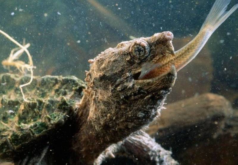 Охота черепахи тоже занимает особое место в ее уникальных способностях. Перед началом охоты животное ложится подальше в иловые отложения на дне и высовывает красный язык наружу. (Кстати, червеобразный язык облегчает ее охоту). Рыба, которая будет находиться рядом и увидит «извивающегося» червяка, непременно подплывет поближе. В этот момент черепаха закрывает пасть с щелчком, после чего рыбе приходит конец – она оказывается съедена хищником глубин.
