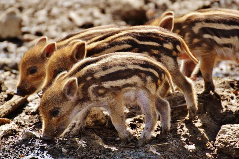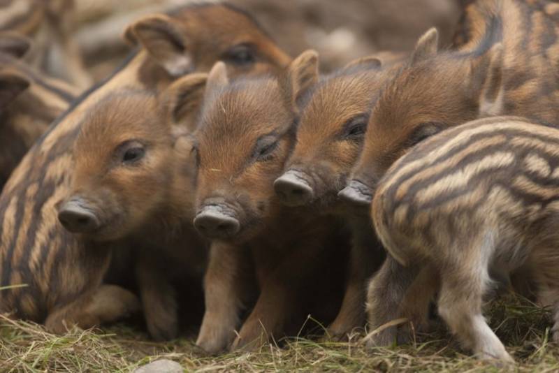 Первое время маленькие кабанчики выглядят умильно-забавными со своими разноцветными полосочками вдоль тела. Малыши рождаются летом и такая пестрая шкурка в значительной степени уберегает их от врагов.