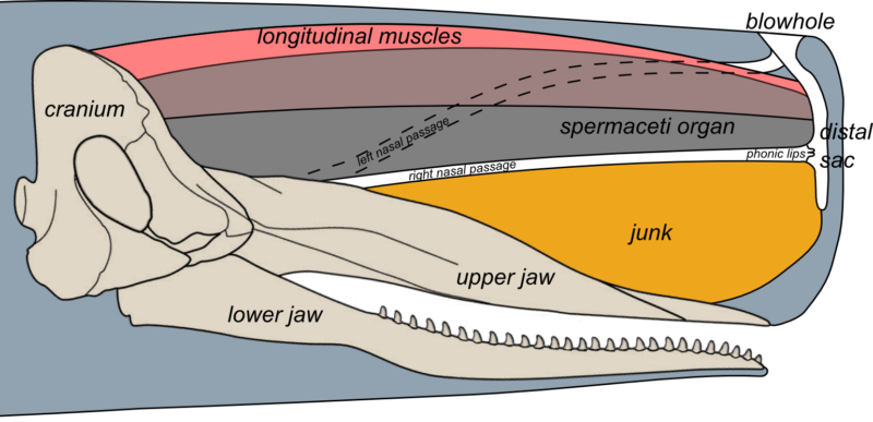 Большой спермацетовый мешок (жировая подушка) занимает почти 90% веса черепа. Какая функция, этой ткани до сих пор не известно. Но, ученные выдвигают несколько теорий.