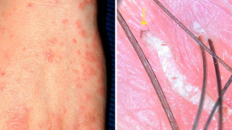 Чесоточный клещ, или зудень проникает под кожу человека, где образует несколько ходов. Ходы проявляются на коже как прямые или извилистые линии грязно-белого цвета.