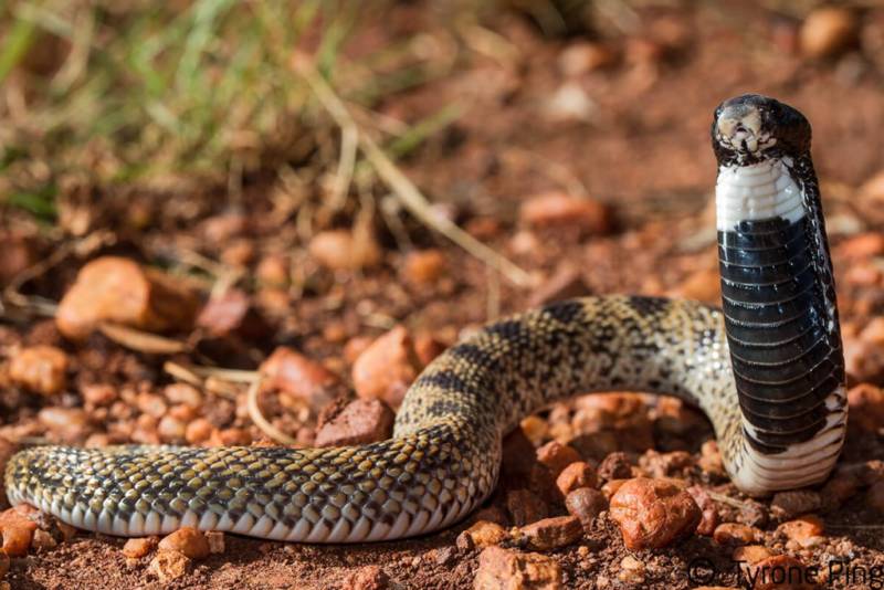 Характерным признаком индийской кобры является светлый рисунок, который видно на раскрытом капюшоне змеи.