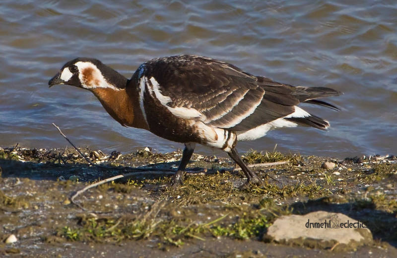 Окраска краснозобых казарок контрастная. Макушка, спина с крыльями и брюшко – черного цвета. Пятна на щеках, шея спереди и грудь имеют красно-коричневый, каштаново-рыжий окрас.