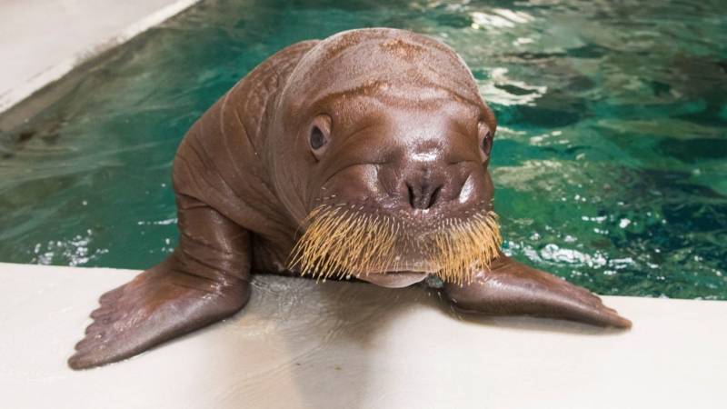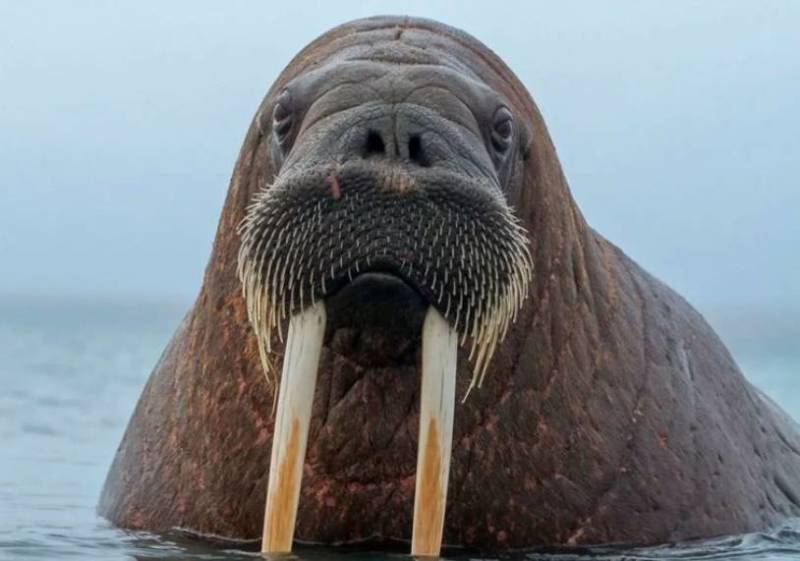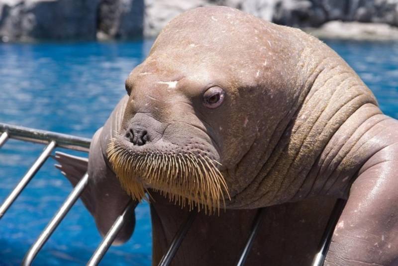 У моржа широкая морда с заметными характерными усами: короткие жесткие волоски расположены в несколько рядов. Внешние уши у животного отсутствуют.