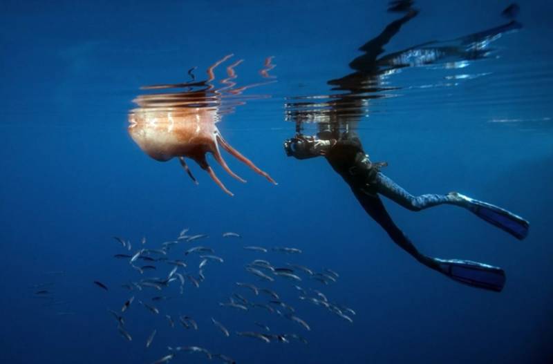 Есть осьминоги, которые имеют большую перепонку между щупальцами, они ее также используют в охоте: садятся на коралл, раздувают «сети», а потом проверяют содержимое.