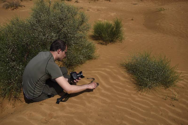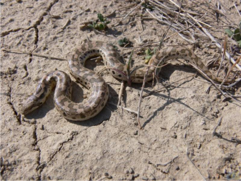 Вчера шол из здания парка Эльтонский на пруд реки Самарогды, расположенного не далеко от впадения ее в оз. Эльтон, вечер пекло спало дул сильный ветер с северо — запада. Грунтовая дорога среди разреженной супесчаной степи вдоль правого берега Смарагды, в 500 метров к востоку от пруда реки Самарогды в колее грунтовой дороги по супеси ползет песчаный удавчик палево-коричневого окраса, длина тела примерно 30 см зафотографировать не смог, так как память телефона была переполнена. а когда уже шол обратно с пруда, то удавчик уже ушел по своим важным змеиным делам и найти его в разреженной полынно-солянковой растительности растущей на супеси уже было очень сложно, так, что встреча моя с ним у меня запечатлелась в памяти, но фотки о столь радостной встречи, я к огромному сожалению сделать не смог.