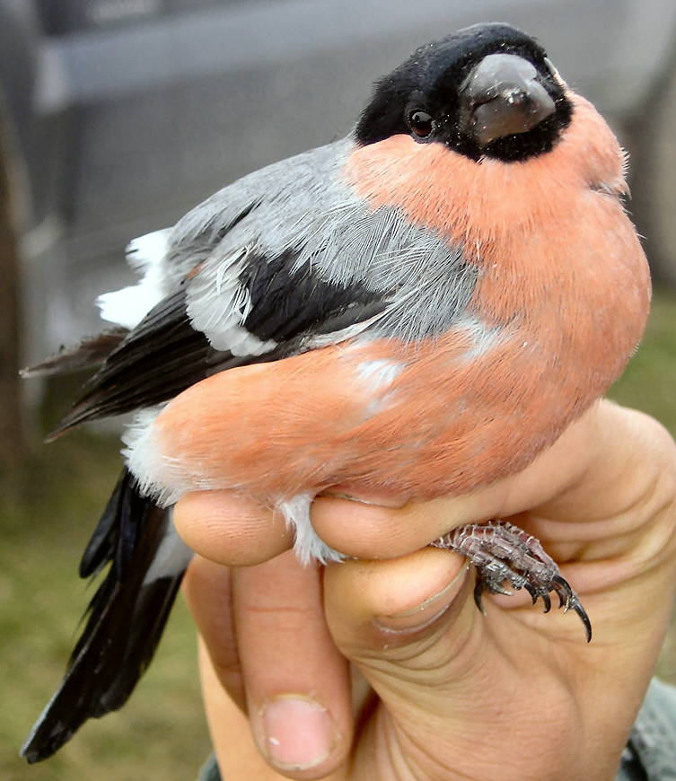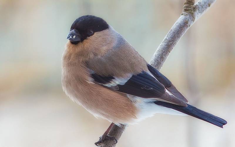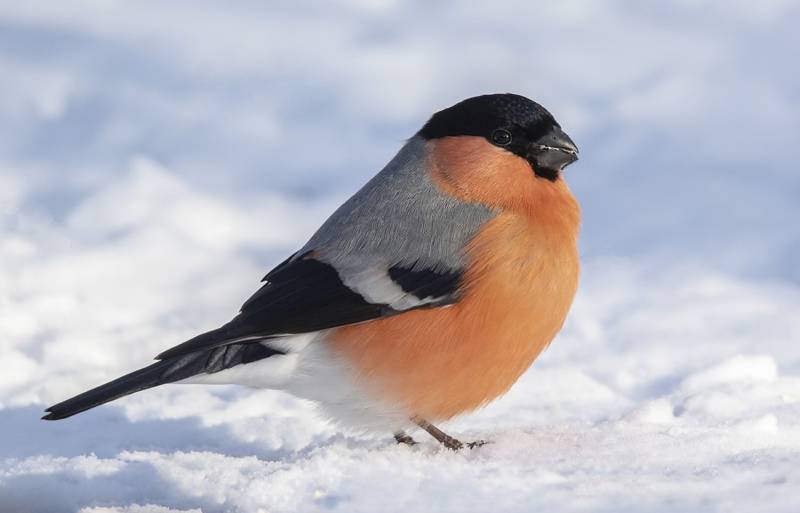 Отличительная особенность снегирей – в их оперении. Верхняя часть головы, вокруг глаз и клюва оперение черного цвета. Маховые и рулевые перья окрашены в черный цвет с синеватым металлическим отливом.