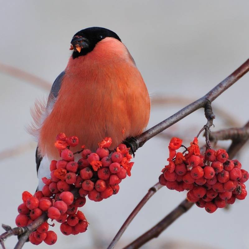 Причем, в отличие от большинства других птиц, снегири никогда не поедают мякоть ягод. Они расклевывают ягоду, извлекают из нее семена, измельчают их и только потом едят. А мякоть ягод остается своеобразным отходом.