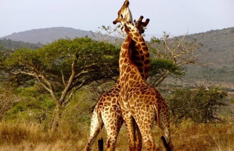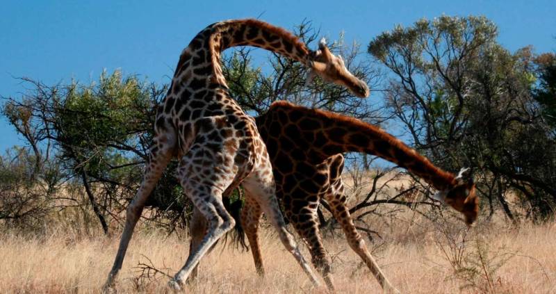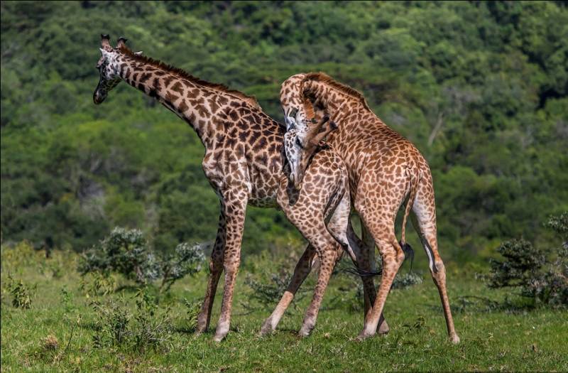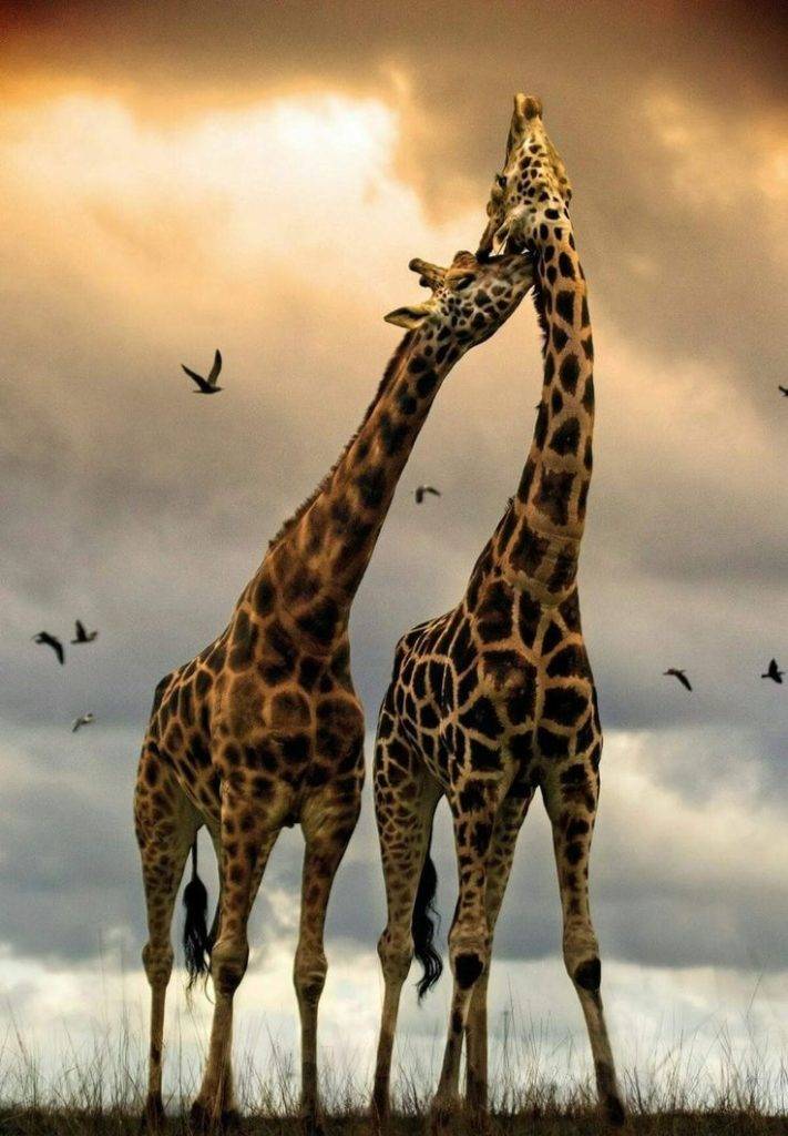 Сентиментальные фотоснимки, на которых жирафы соприкасаются шеями, как бы целуясь, на самом деле демонстрируют борьбу самцов. Это изматывающий «армреслинг» может продолжаться до получаса и требует много сил и упорства.